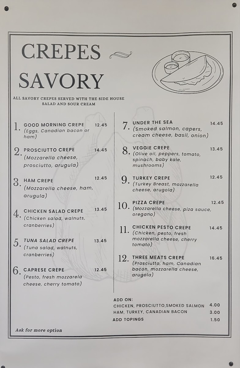 Choice of smoked salmon, capers, cream cheese, basil, onion. Side of local salad, sour cream.